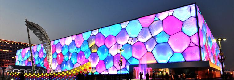 ETFE膜材通常為無色透明狀,也可以做成白色。根據(jù)需要可在透明或白色膜材上印制各種圖案。以0.20mm厚的ETFE膜材為例,單層透明膜材的透光率高達(dá)95%,白色膜材為50%~55%。利用白色膜材或在透明膜材上印制不同的顏色和圖案,可調(diào)節(jié)進(jìn)入建筑物內(nèi)的光線。