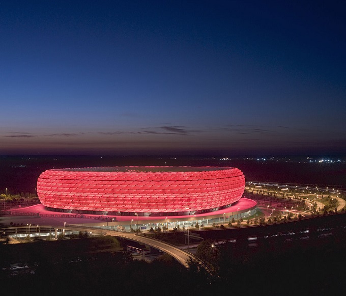 慕尼黑安聯(lián)球場(Allianz Arena)以它精巧的結(jié)構(gòu)壯麗的外觀,成為慕尼黑以至于德國的榮耀。安聯(lián)體育場是歐洲最現(xiàn)代化的球場,外墻體由2874個ETFE膜結(jié)構(gòu)氣墊構(gòu)成,其中1056個在比賽中可以發(fā)光,當(dāng)體育場中比賽的球隊發(fā)生變化時,墻的顏色就可以隨之改變,其奇妙之處將遠(yuǎn)超想象。
