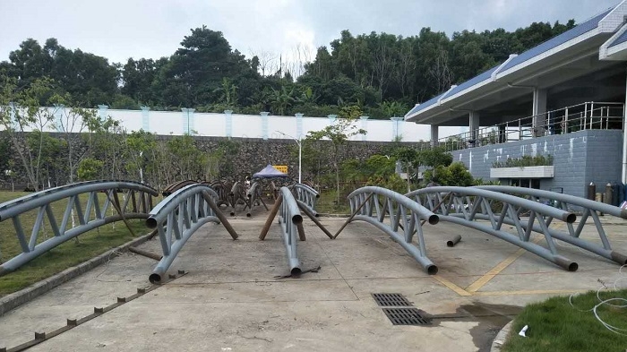 經(jīng)過一段時間的準備,燁興膜結(jié)構(gòu)觀瀾水廠水池加蓋項目悄然動工,目前該項目正處于鋼結(jié)構(gòu)拼裝加工階段。從現(xiàn)場發(fā)回來的照片可以看到,該項目的弧形鋼構(gòu)都是在我們的鋼鐵廠進行預成型后再拉到現(xiàn)場進行拼裝,現(xiàn)在多條龍骨已經(jīng)加工完成,并已經(jīng)圖上防銹底漆。
