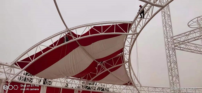 燁興-新疆喀什馬戲團(tuán)膜結(jié)構(gòu)表演館頂部和側(cè)面都是用膜布進(jìn)行包裹覆蓋,總用膜量近5000平方米,都是在我們燁興自有的膜結(jié)構(gòu)工廠進(jìn)行裁剪熱合加工,然后再運(yùn)往現(xiàn)場(chǎng)。得益于當(dāng)?shù)爻掷m(xù)的晴朗天氣,項(xiàng)目穩(wěn)步有序推進(jìn)。