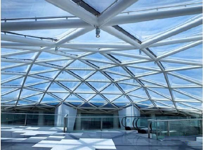 材料適應性:ETFE膜材是由氟塑料制造的,特有的抗粘著表面使其具有高抗污、易清洗的特點,一般雨水即可清除表面污垢。在環(huán)境適應方面,ETFE能直接暴露在-200℃—150℃的溫度中,基本能滿足各種氣候地域;ETFE具有耐腐蝕特性,同時又有對金屬特有的較強粘著特性,克服了聚四氟乙烯對金屬的不粘合性缺陷,加之其平均線膨脹系數(shù)接近碳鋼的線膨脹系數(shù),使ETFE(F-40)成為和金屬的理想復合材料,具有極優(yōu)良的耐負壓特性。