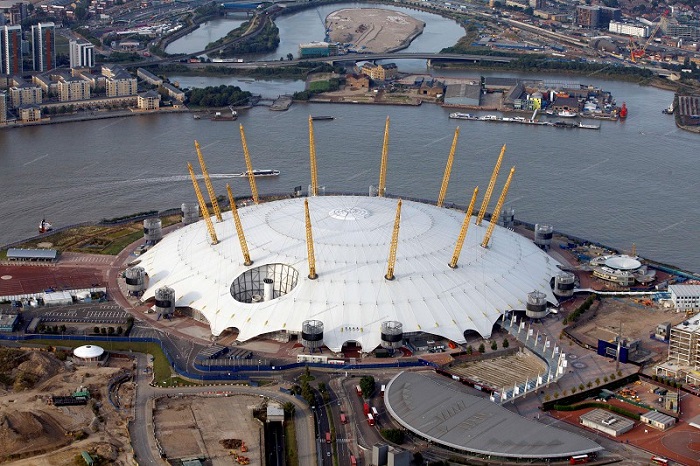 千年穹頂位于倫敦東部泰晤士河畔的格林威治半島上,是英國政府為迎接21世紀(jì)而興建的標(biāo)志性建筑。彎項直徑320m,周圈大于1000m,有12根穿出屋面高達(dá)100m的桅桿,屋蓋采用圓球形的張力膜結(jié)構(gòu)。