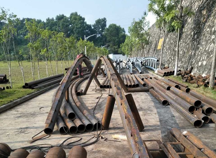 經(jīng)過一段時間的準備,燁興膜結(jié)構(gòu)觀瀾水廠水池加蓋項目悄然動工,目前該項目正處于鋼結(jié)構(gòu)拼裝加工階段。從現(xiàn)場發(fā)回來的照片可以看到,該項目的弧形鋼構(gòu)都是在我們的鋼鐵廠進行預成型后再拉到現(xiàn)場進行拼裝,現(xiàn)在多條龍骨已經(jīng)加工完成,并已經(jīng)圖上防銹底漆。